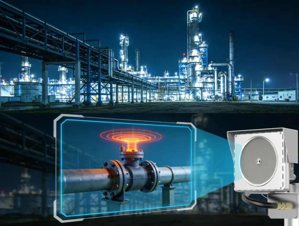 超声波成像测漏系统(Acoustic Imaging Leak Detection System,简称AILDS)由杭州兆华电子股份有限公司研发,目前已在多家煤化工、石化、天然气企业的装置区上线运行,用于高空、高危区域的在线泄漏监测。本文由兆华电子AILDS项目团队撰写,基于实际部署与运维经验整理而成,并用通俗的方式聊清楚:为什么要用这种系统、它大概怎么工作、现场用了之后究竟有什么变化、以及它能做什么、不能做什么。 一、传统泄漏巡检,难在哪儿? 在石化、天然气场站、煤化工、危化品堆场,大家对“泄漏”这两个字有多敏感,就不用多说了。真正麻烦的是:很多关键点位都在20米左右的高空。 过去要查一个高空微小泄漏,大多是这样的流程: 搭脚手架、上吊笼,上下折腾好几个小时; 人带着肥皂水、便携仪器在管线间钻来钻去; 冬天手冻僵、夏天汗湿透,查完一圈心里还不踏实——“这么多阀门、法兰,会不会还有漏掉的?” 总结下来,传统泄漏巡检普遍有几件“老大难”: 点位高:20米管廊、塔器顶部、人难上去,临时搭设成本高,作业风险也高。 声音小:微小泄漏产生的超声波信号,被泵机、风机噪声淹没,靠耳朵几乎听不出来。 看不见:早期泄漏流量小,肥皂水不起泡,气味不明显,等“看见油迹、闻到味”时往往已经扩散。 效率低:一套装置区动辄上千个监测点,人工“爬上爬下”更多是抽查,很难做到真正的连续、全覆盖。 传统的电化学、红外、激光等检测方式,本质上还是点或线的监测: 在某个固定点测量“有没有超标”; 沿一条光路看“有没有气体通过”。 而现场真正想要的是: 不仅要知道“有没有泄漏”, 更希望在一大片区域里,看清楚“到底哪儿在漏”。 这正是超声波成像测漏系统(AILDS)要解决的问题。 二、超声波成像测漏系统AILDS:让“听不见的泄漏声”长成屏幕上的“彩云” 基本原理:带压气体泄漏→超声波监测→彩色云团定位 AILDS的工作过程: 带压气体泄漏→产生特征超声波→多通道采集→声学成像→在画面上用“彩云”标记漏点。 当带压气体通过阀门缝隙、法兰微裂、焊缝缺陷喷出时,会和周围空气产生剧烈湍流,形成一类有明显特征的超声波信号: 泄漏量越大,超声信号越强; 压差越高,声学特征越明显; 与电机、泵机那种偏低频的机械噪声不同,便于从背景声中“拎出来”。 AILDS做的,就是想办法把这种“听不见的声”变成“看得见的图”: 1.使用多通道超声波传感器阵列,从多个方向同步采集超声信号; 2.在前端做放大、滤波、去噪,尽量剔除电磁干扰和低频背景噪声; 3.对多通道信号做相位差/强度差分析,估算不同空间位置的声能分布,推算出泄漏声来自哪个方向、哪一块区域; 4.把声能分布映射成二维“热力图”,再叠加到现场视频画面上。 最后,泄漏信号最强的地方,会在屏幕上长出一团红黄绿色的“彩云”。对现场人员来说,效果非常直观:画面里哪里有彩云,哪里就“很可疑”。 工程参数:大概能扫多远、能扫多小? 从多个在线运行项目的现场测试和联合标定结果来看,AILDS在工程应用中的典型能力大致如下: 推荐检测距离:0.5~50m 在1~30m范围内,对微小泄漏有更好的信噪比和成像效果; 工作频段: 超声波频段(高于20kHz),通过带通滤波选取泄漏特征频带(20~40kHz),抑制可闻频段和低频机械噪声; 最小可检泄漏量/孔径(典型工况): 在最低0.6MPa压差条件下,对阀门缝隙、法兰微缝等0.1mm量级早期泄漏具备可视化检测能力; 实际灵敏度会随介质种类、压力、背景噪声和布点方式有所变化; 定位精度: 在推荐距离内,可提供厘米级泄漏点位置,配合视频画面,在画面上“指点”到具体设备或法兰区域。 这些数值不是“绝对不变的标准线”,而是我们在多个现场项目中验证过的典型工程水平。 防护等级: 通过Ex ib IIC T6 Gb防爆认证,IP66防护认证,适用于典型危险区域的长期在线部署。 系统架构:不只是一个探头,而是一整套在线系统 AILDS不是一只“聪明的传感器”这么简单,而是一整套在线监测系统,可以大致拆成三层: 1.前端感知层 云台式超声波成像测漏仪部署在现场,负责“听泄漏声、看现场画面、输出彩云图”; 支持云台旋转、俯仰,做大范围扫描。 2.中端存储层 NVR等存储设备接收前端数据; 将视频、声学图像、告警记录完整留存,便于后续回放和事故分析。 3.后端管理层 VMS等管理平台接入多个前端; 统一做设备管理、检测控制、告警展示、报表统计,将信息集中呈现到中控室大屏。 可以用一句话来形容: 前端“看见漏点”, 中端“记住过程”, 后端“一屏管全场”。 一个典型现场:从“爬管廊”到“看彩云” 以宁夏某煤化工装置区为典型案例,目前已在现场已部署11套AILDS,覆盖气化炉、加热炉、罐区、管廊等多类场景。看看现场在引入AILDS之后,实际工作方式是怎么变的。 改造前:6个人爬半天,还是“心里没底” 典型的气化炉装置区: 气化炉装置区内分布着大量高温高压管道、阀门和法兰; 很多关键点位在20米左右高空; 介质多为可燃和有毒气体,一旦泄漏不只是损失原料,更牵涉人身安全和装置稳定。 过去的巡检,大致是这样进行的: 安排数名巡检和检修人员,提前搭好平台、上管廊; 带着肥皂水、便携式检测仪,沿着管廊和平台一家家地排查法兰和阀门; 一圈下来,少说也得大半天,遇到大检或专项排查,甚至要连干几天。 一线同事对这种模式的评价很直接:“累,慢,