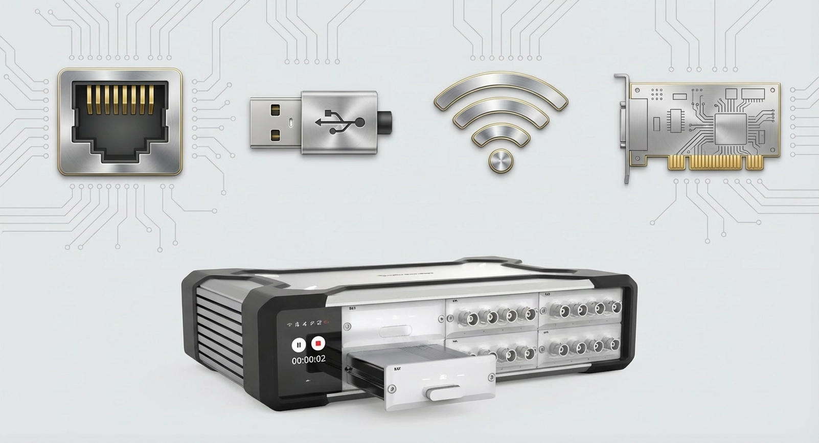在正式地进行数据采集前,至关重要的一步是连接数据采集前端与PC,通常工程里主要有这几种方式:USB 外置直连、Wi-Fi 无线连接、以太网、PXIe 等。 本文将从这四种常见连接方式的区别、优势点、局限性几个维度,展开进行介绍,帮助用户对数据采集有更深层次的了解。 一、以太网连接 以太网连接是指采集前端通过网口进入局域网,PC 通过IP网络访问前端。它典型的数据链路如下: 传感器→前端采样→ 以太网传输(TCP/UDP 等)→PC/服务器存储与处理,这种部署拓扑从简单到复杂都很常见,比如: 前端 ↔ PC 直连(点对点) 多前端 → 交换机 → PC/服务器(分布式) 以太网连接的优点: 拓扑灵活:单点、多点、分布式都能组织起来; 距离与布线从容:网线/光纤在跨房间、跨楼层、跨区域布点上更舒服,工程上也更容易规范化走线; 网络基础设施成熟、可维护性强:交换机、网线、模块、光纤、机柜配套非常成熟;出现问题时也更容易定位; 以太网连接的局限性: 网络环境会引入不确定性,拓扑、交换机能力、端口拥塞、广播风暴、链路错误都可能导致体验波动; 多设备/多节点时,对网络规划要求上升,包括 IP 地址规划、网段划分、是否需要 DHCP、是否跨网段路由、交换机级联层数等。节点一多,不规划就容易乱。 网线质量、屏蔽接地、走线靠近强电、端口接触不良、交换机电源波动,都可能表现为丢包/重传/速率协商异常 对于工程师来说,以太网连接的使用体验很直接:在试验场地里往往只需要一根网线,就能把数据采集前端和PC快速连起来,参数配置、开始/停止采集、实时查看与存盘都能顺畅完成;当测试距离拉长时,可以通过增加网线长度,或在更远距离下采用光纤链路,把数据稳定传回到电脑侧;在跨楼层、跨房间甚至噪声/安全限制较多的现场,工程师也不必近距离待在试验区域,通过网络在办公室或控制室就能完成采集与监控。当然,网线太长也是一件让人苦恼的事情。 SonoDAQ Pro标配了两个千兆网口(GLAN,菊花链级联,支持90W PoE++供电),且还配备了具备千兆带宽的USB-C口,给用户更加灵活的网口连接方式。 二、Wi-Fi连接 Wi-Fi 无线数据采集指采集节点通过无线网络与 PC 或局域网通信。和“网线换成无线”不同的是,Wi-Fi 采集系统通常会有两种典型工作方式: 实时回传型:采样后实时通过 Wi-Fi 把数据传到 PC; 本地缓存/存储型:数据先在采集端缓存或存储,Wi-Fi 主要用于控制、预览、回传片段或任务结束后导出。 组网方式也常见两类: 数据采前端接入现场 AP(STA 模式); PC开启热点,数据采集前端连接热点。 总之,需要数据采集前端有连接Wi-Fi能力,其次需要与PC处在同一个局域网中。 Wi-Fi连接的优点: 免布线:无法走线/不允许走线时,DAQ直接放在采集点的近端,工程师直接通过Wi-Fi控制DAQ进行数据采集; 灵活数据采集:通过将DAQ IP映射至公网,PC通过IP地址访问DAQ,从而进行超远距离的数据采集控制。 Wi-Fi连接的局限: 连续大数据量传输不确定:无线链路可用带宽随时变化,长时间连续采集更容易暴露丢包/重传/缓存溢出等问题,数据越大、越“拉满”越明显; 稳定性受环境影响大:多径反射、同频干扰、AP并发/拥塞、设备移动导致信号路径变化,都会带来吞吐波动、时延/抖动增大,表现为实时曲线卡顿、偶发掉线或重连。 在实际的工程应用中,Wi-Fi 连接常出现在不方便或不允许布线的测试任务中,或者有远程/异地数据采集的需求,而不方便部署网线的情况。工程师可在电脑端远程配置参数、启动/停止采集、查看关键指标或抽取关键片段;如果数据量较大或需要长时间记录,通常会配合前端的缓存/本地存储,让 Wi-Fi 负责“看得见、控得住、回得来”,而数据完整性由数据采集前端兜底。 三、USB连接 USB 数据采集设备通常指:采样发生在外置前端(前端内置ADC/调理/时钟等),PC 负责参数配置、显示分析和数据存储,USB 负责把数据“搬进电脑”。系统关系一般是PC 作为 USB Host,采集前端作为 USB Device。 USB连接的优点: 部署门槛低、上手快,不用配 IP、不依赖网络环境,插上设备、装好驱动/软件基本就能开始采集; 便携性强,外置盒子+笔记本的组合很常见,适合外场、客户现场、临时布点等需要“带着走”的任务; USB 接口普及度高,线材、转接、固定夹具、扩展坞等配套好找; USB连接的局限: 扩展性通常不如网络/平台型方案自然,当系统从“单前端”扩到“多前端、多点位协同”,USB 的布线、管理与同步方式会更依赖具体实现; 同一 USB 控制器下挂多个高吞吐设备(采集前端、外置 SSD、摄像头等)时,可能出现吞吐波动、缓冲告警、偶发卡顿。 不同电脑的 USB 控制器、驱动栈、系统负载、电源管理策略不同,同一设备在不同主机上可能表现差异明显。 常见的 USB 采集前端多为便携式外置设备,这类设备通常集成较完整的通用测量接口,例如模拟量输入/输出、数字 IO、计数器/编码器等,通过一根 USB 线即可完成与 PC 的连接与控制,实现数据采集、显示与存储。它在外场/客户现场的临时测量、研发阶段的快速验证与调试、小通道短时间测试等方面应用广泛。 四、PXIe连接 PXIe 是“机箱 + 背板 + 模块”的平台形态。采集/仪器模块插在机箱内,通过背板互联;机箱再通过控制器或外部链路与 PC 工作站协同。它与“单个外置采集盒”的差别在于:平台化、模块化、系统级组合能力更强。 如果机箱内部