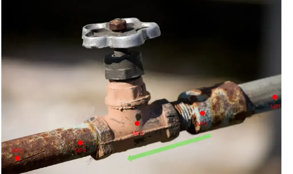 • MP5 测点:位于阀门下游管道,距离 MP4 测量点 1~2 倍管径处(建议放置在阀门法兰后方的管壁上)。若无足够距离,MP5测点与MP4测点距离可缩短到0.5倍管径。