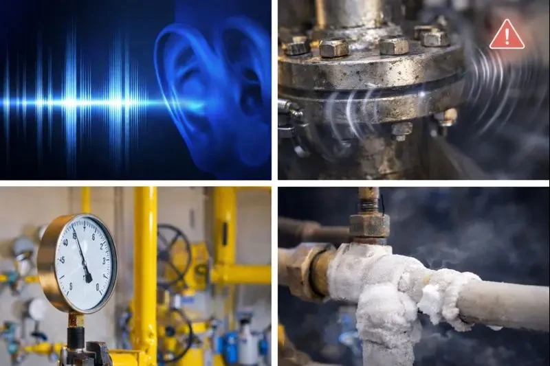 当阀门关闭后,密封面未能完全贴合,介质就会在压差驱动下从高压侧经缝隙窜到低压侧,形成高速微射流与湍流。泄漏一般带来以下几个典型表现:声波/超声、振动、压力异常、温度异常/结霜等。