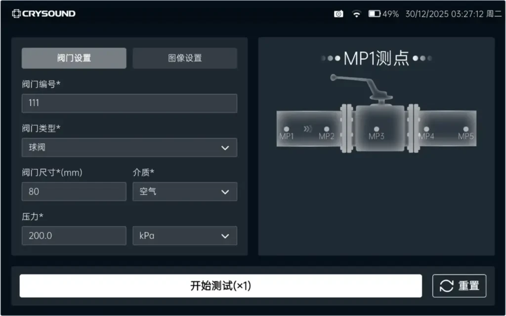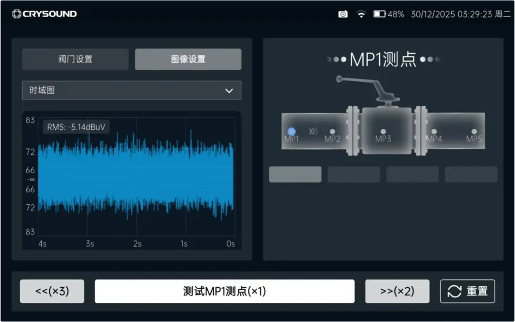 在 CRY8120 阀门内漏功能中,软件采用检测流程化、可视化设计:操作员按提示将接触超声传感器依次接触测点,点击测试即可,结果会在界面显示,测试后由算法自动判定是否有内漏。