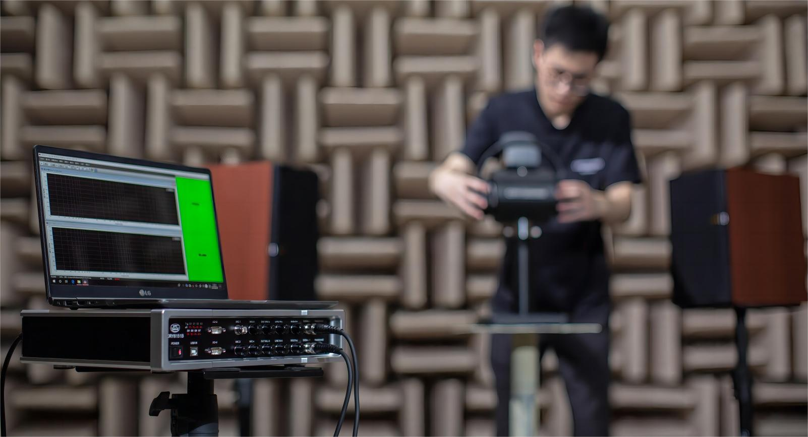 为了实现精确的声学测试,CRYSOUND兆华电子提供高效的消声室解决方案。我们的消声室采用多层隔音材料设计和隔振措施,有效屏蔽外部噪音和振动,确保测试环境的稳定性。 腔室的每个表面都配备高效的吸音楔形结构,其吸声系数在截止频率以上超过 0.99。这确保了被测设备发出的声音能直接到达测量设备,消除不必要的反射,确保测量精度。