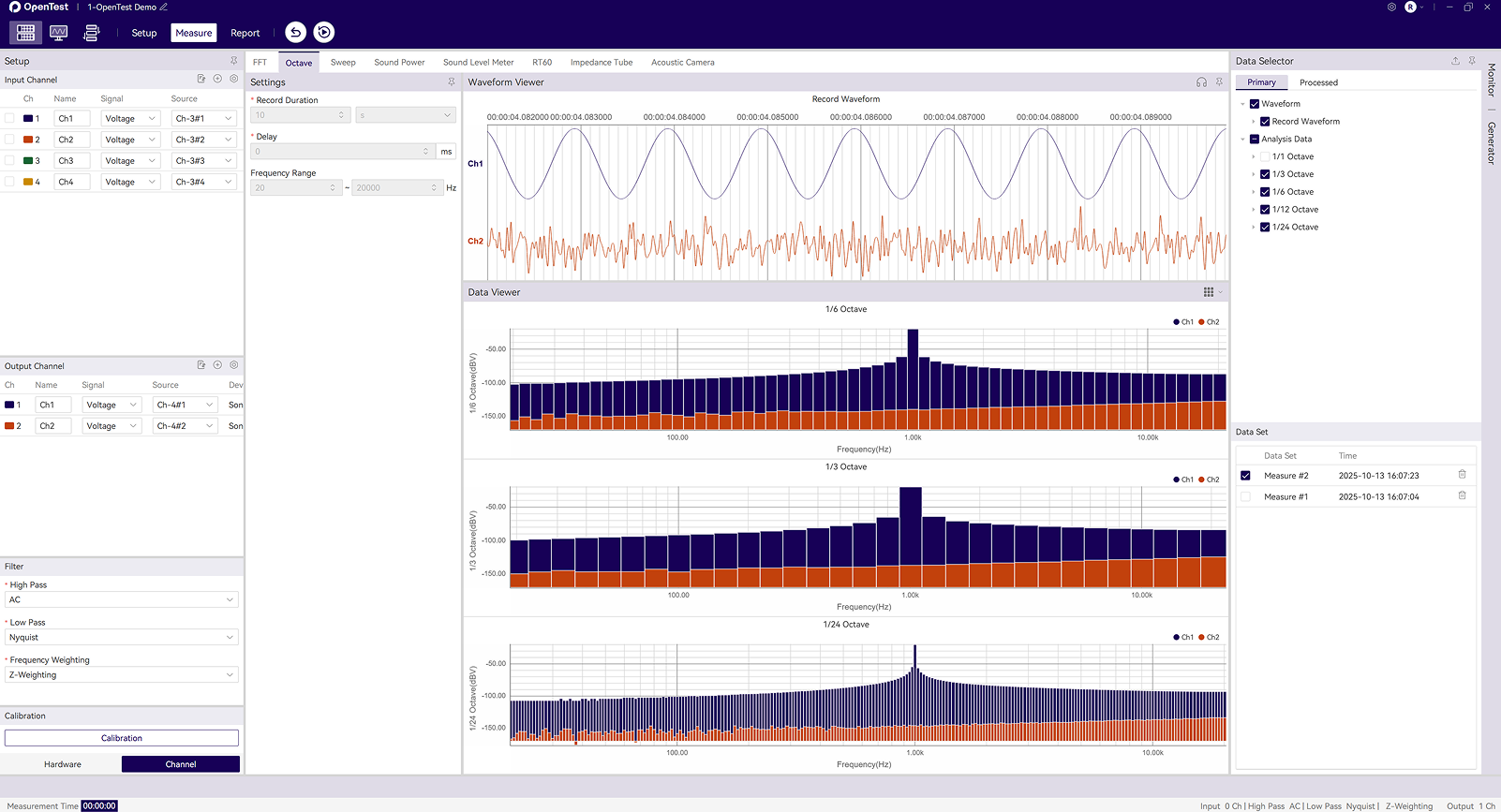 倍频程分析功能提供两种核心工具:基于 FFT 的快速分析与基于滤波的标准分析。在设定录制时段内,系统可对采集波形同步开展多通道、不同倍频程宽度的分析,灵活适配多样测试场景。用户可根据需求自定义频率范围,叠加 A/C/Z 频率计权,并同步分析 1/1oct.、1/3oct.、1/6oct.、1/12oct.、1/24oct. 等多种倍频程类型;分析结果支持以柱状图、折线图、表格三种形式直观呈现,便于数据解读与留存。